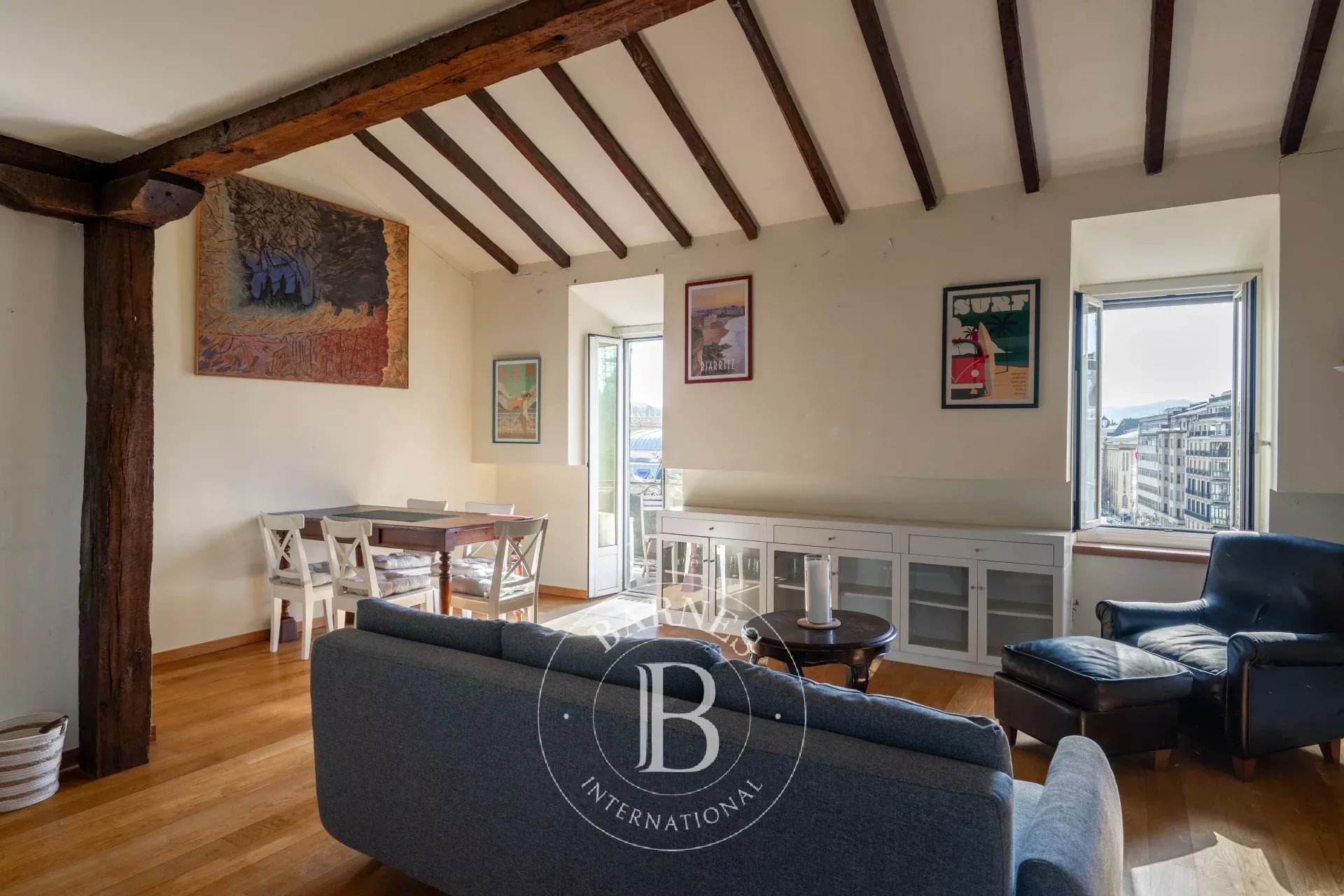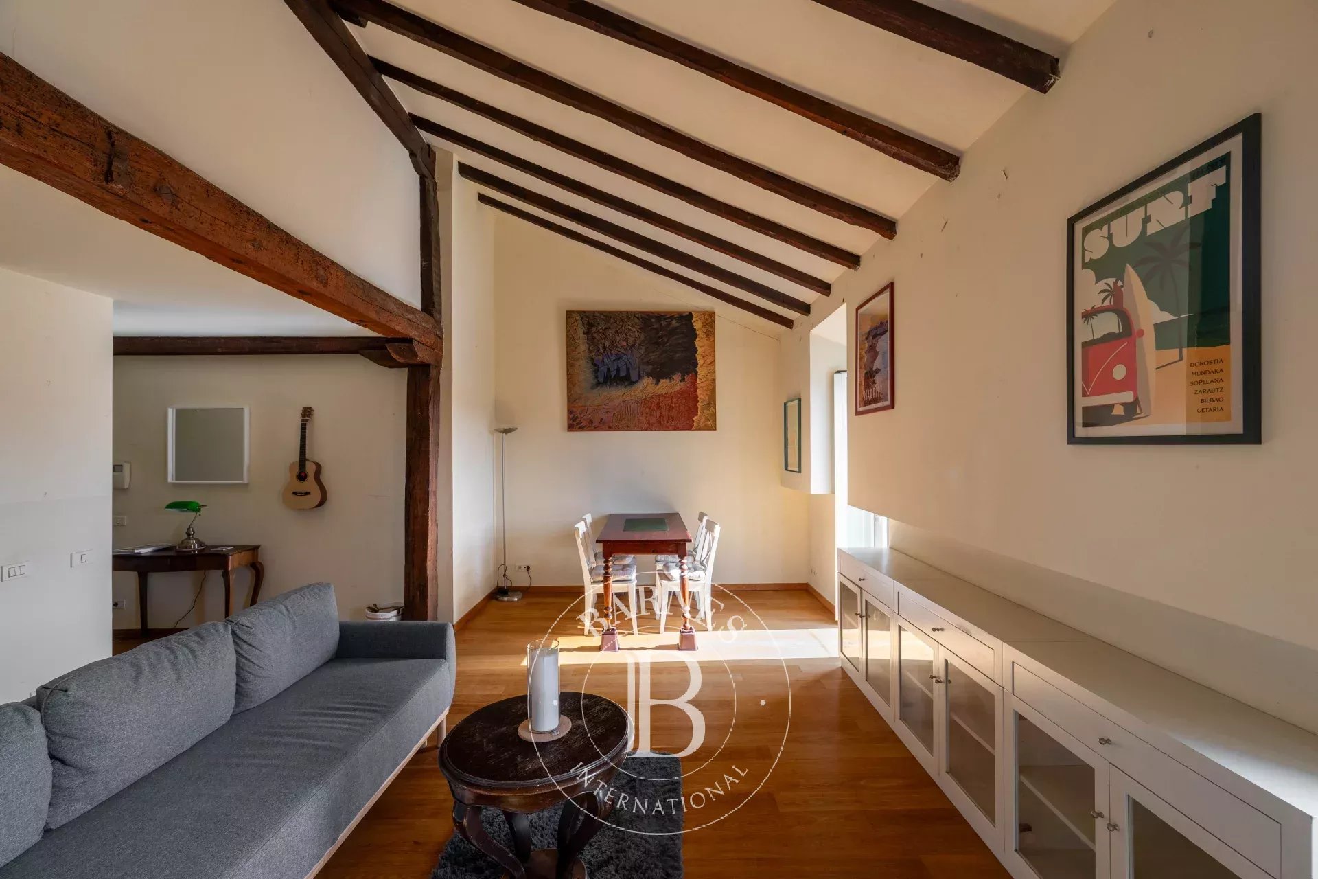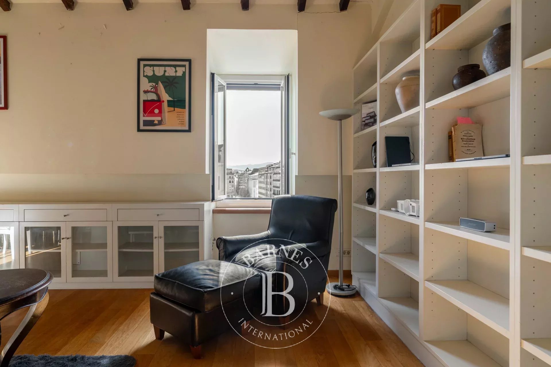 El carácter propio del ático se manifiesta en sus techos abuhardillados con vigas de madera vistas, sus suelos de madera natural y la presencia de múltiples ventanales. Su altura, su privilegiada exposición y la orientación sur de la terraza refuerzan la luminosidad y aportan una sensación de amplitud y apertura poco habitual en pleno centro urbano.