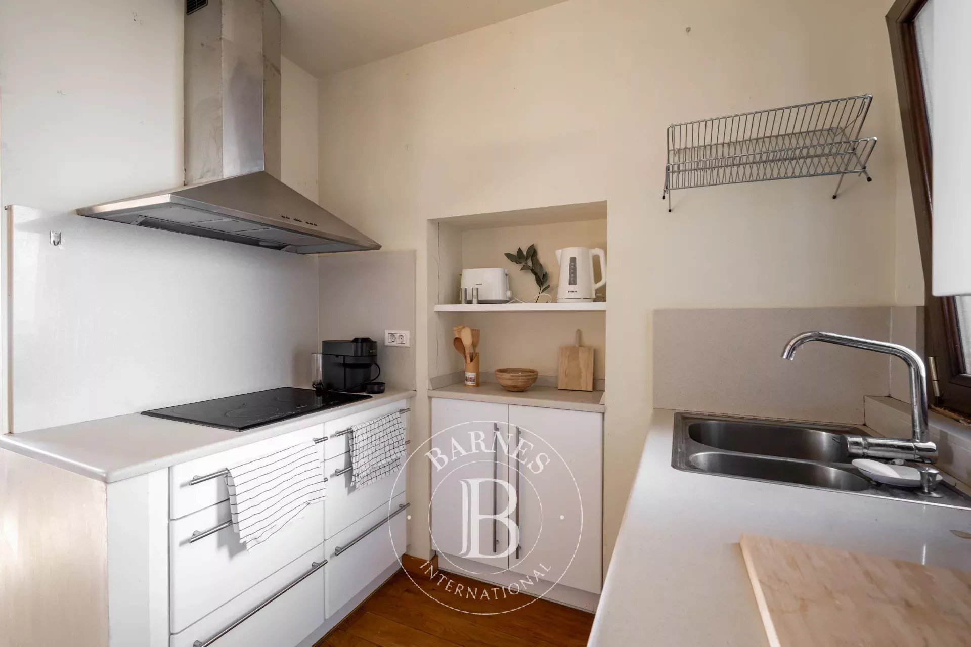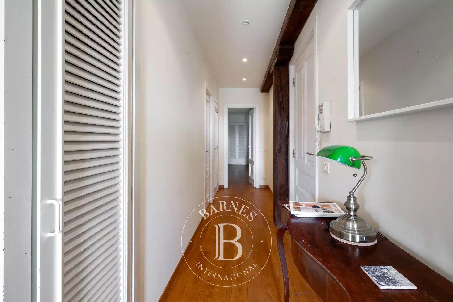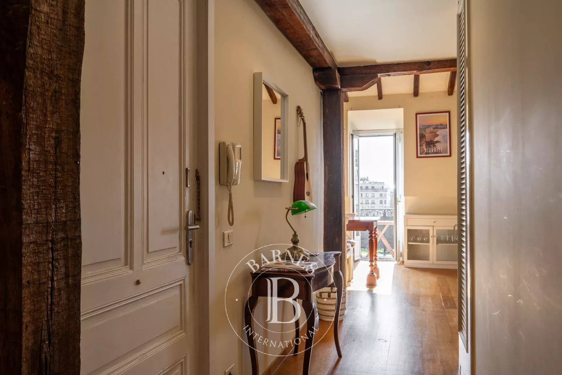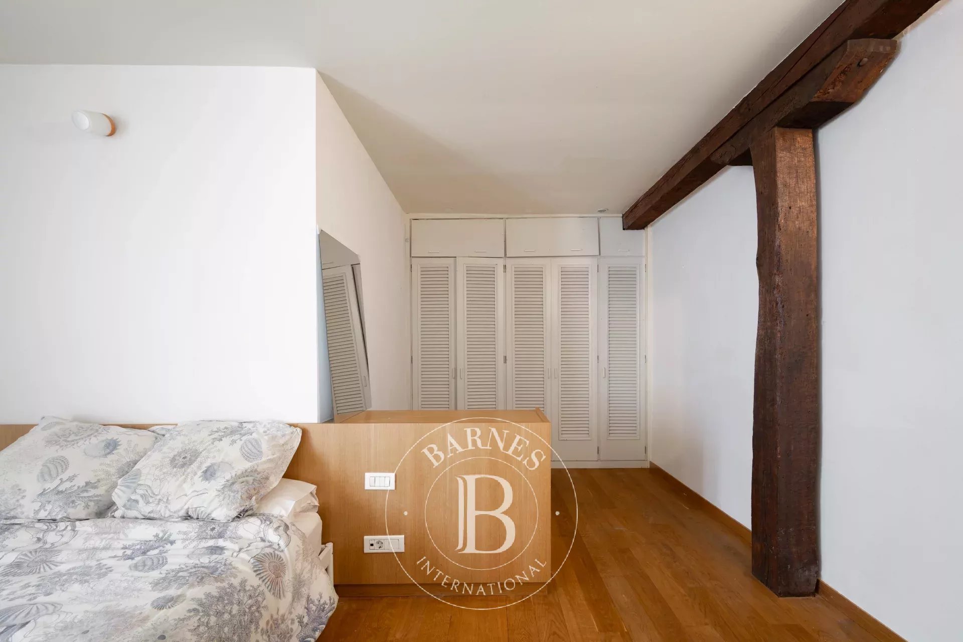 El carácter propio del ático se manifiesta en sus techos abuhardillados con vigas de madera vistas, sus suelos de madera natural y la presencia de múltiples ventanales. Su altura, su privilegiada exposición y la orientación sur de la terraza refuerzan la luminosidad y aportan una sensación de amplitud y apertura poco habitual en pleno centro urbano.
