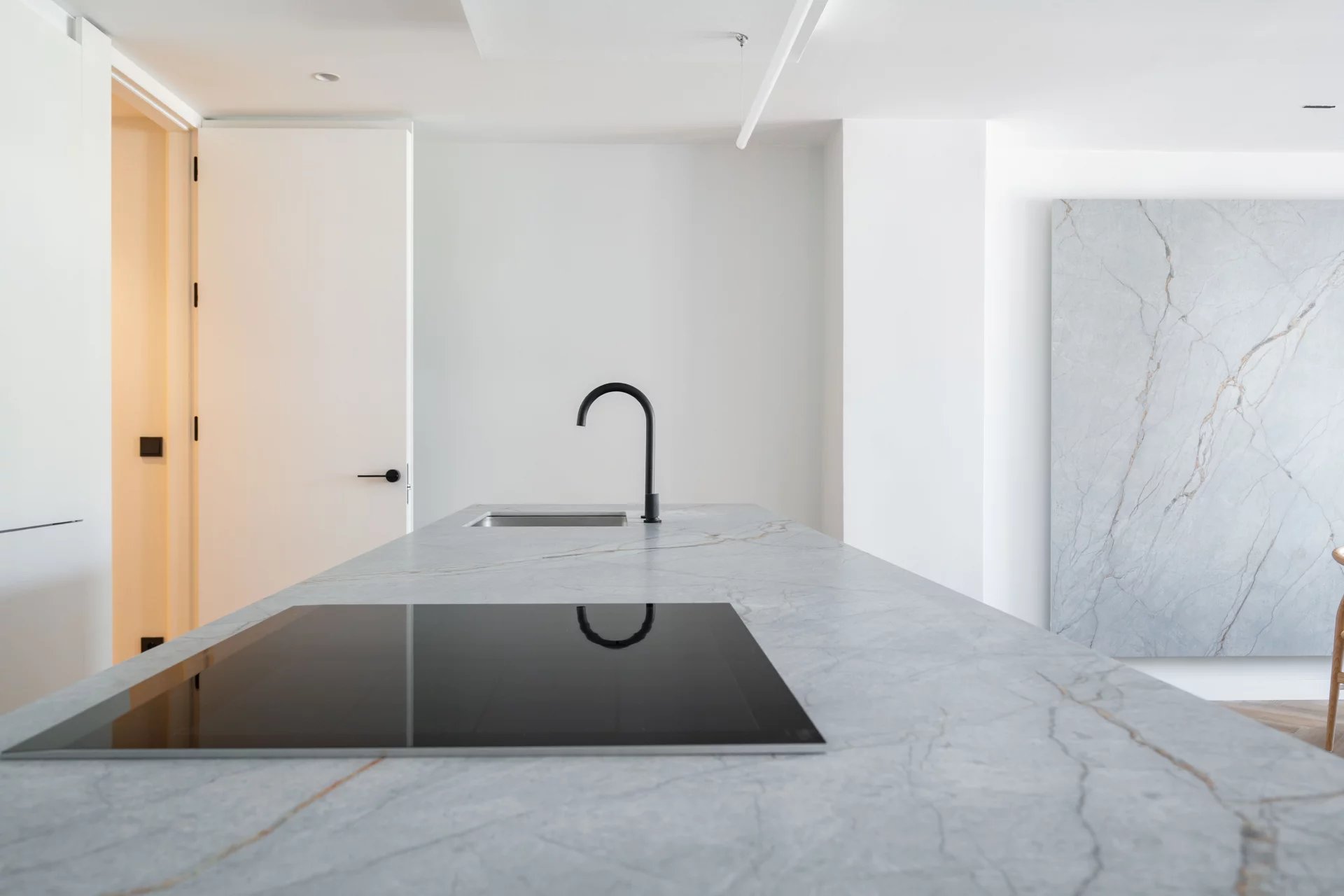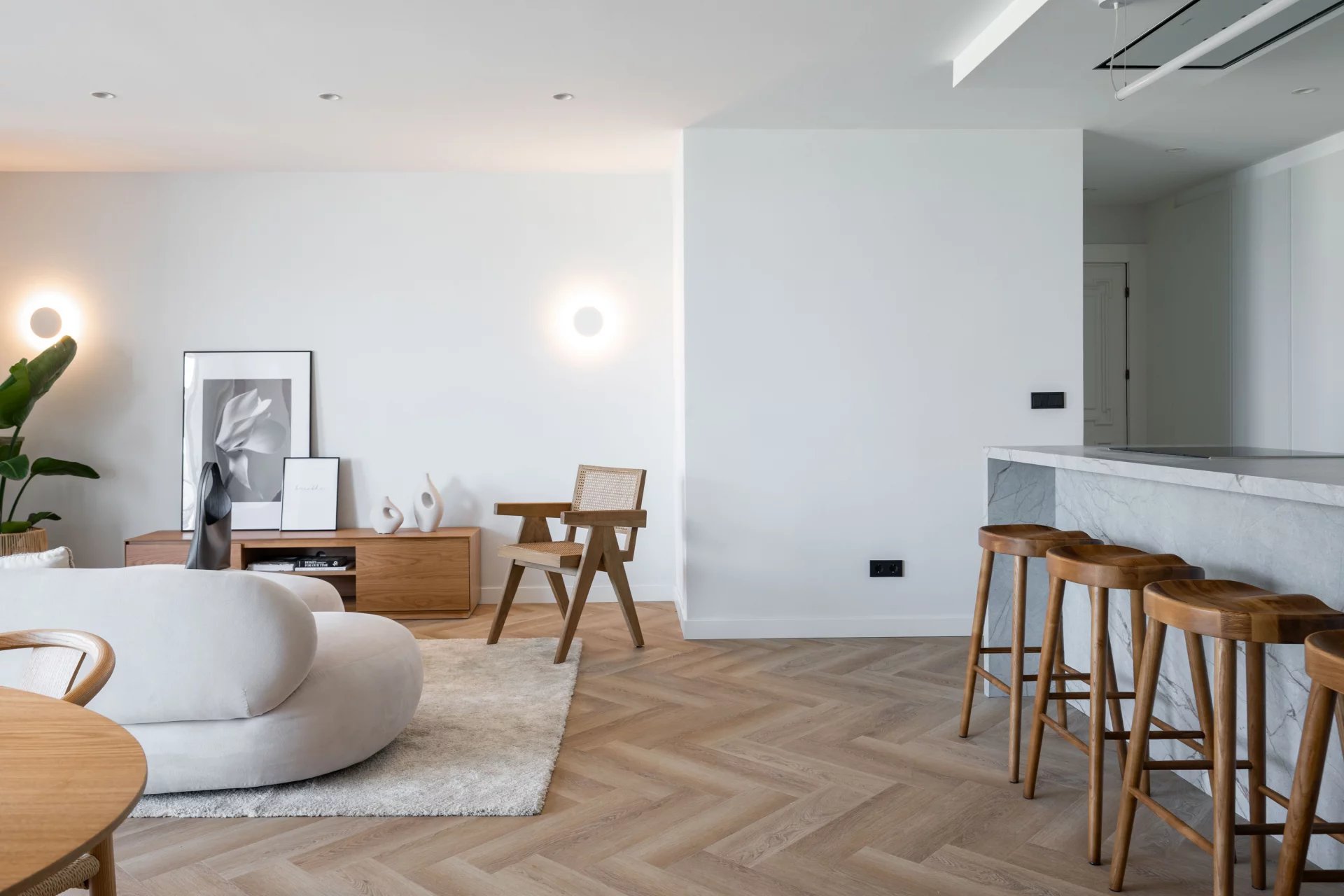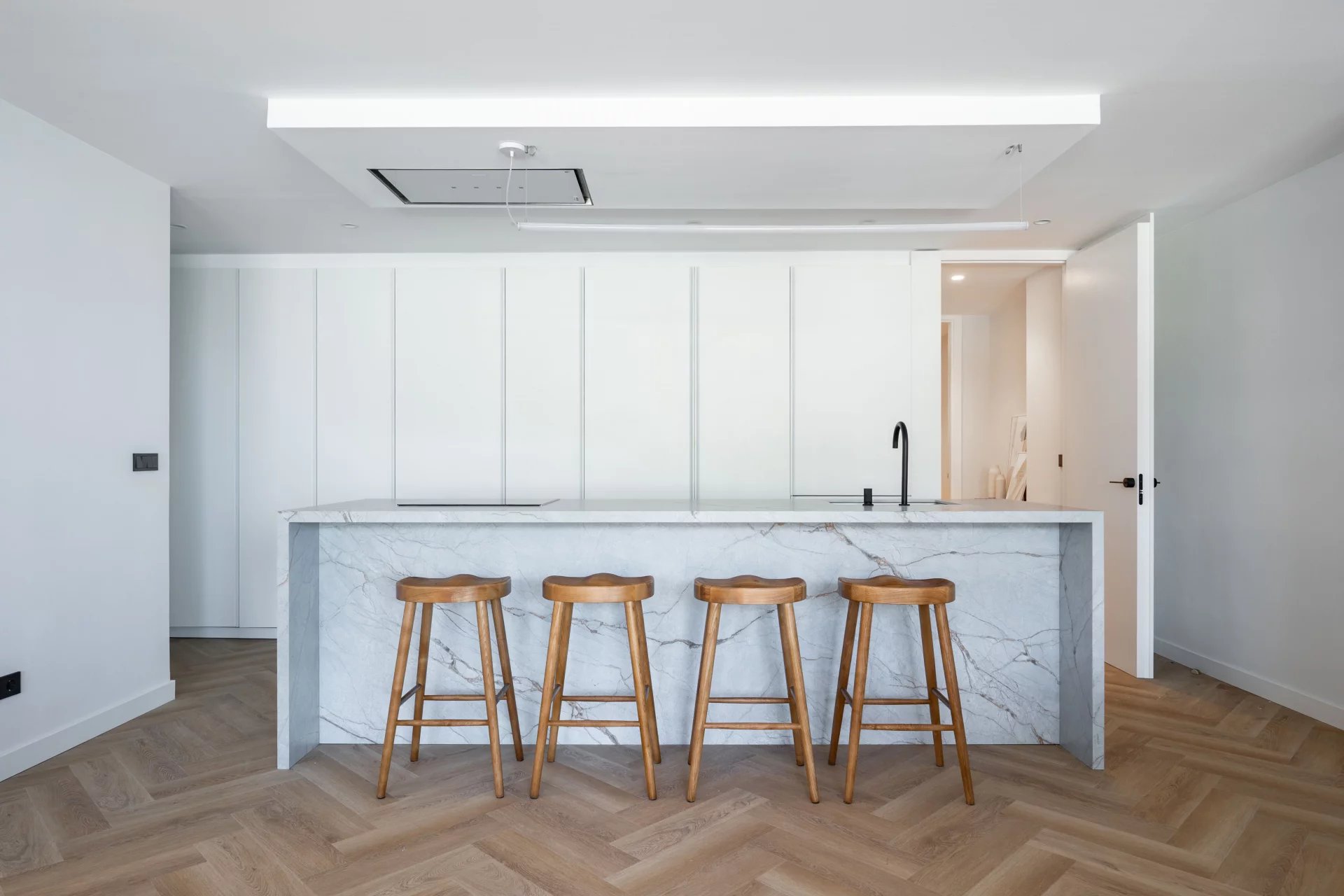 En la zona de día, un luminoso salón-comedor con grandes ventanales ofrece acceso directo a un balcón orientado al mar, donde se pueden disfrutar vistas panorámicas de la bahía. Integrada en este espacio, una moderna cocina americana de líneas depuradas realza la armonía del conjunto.