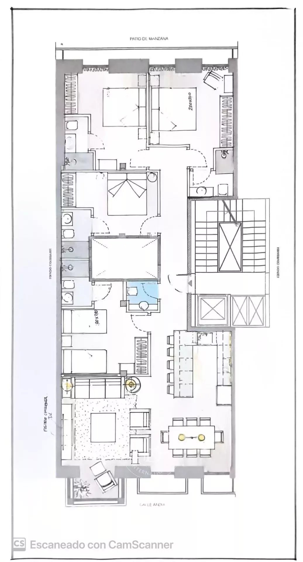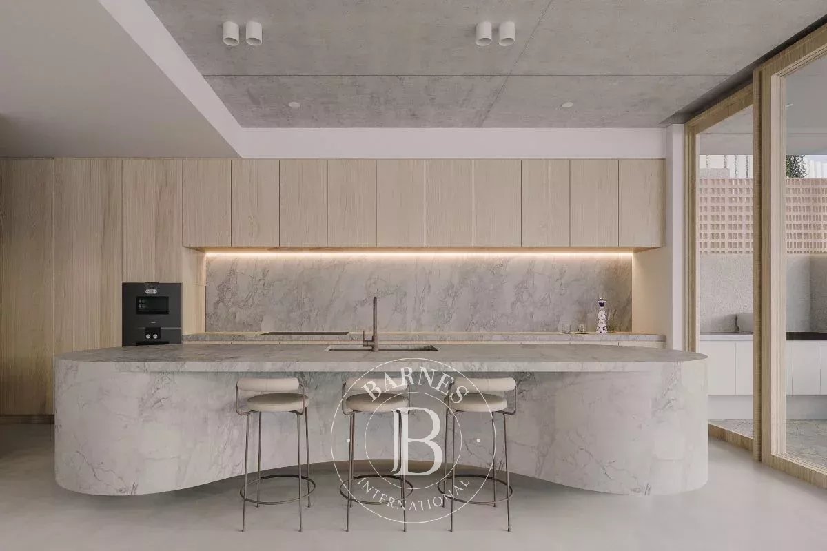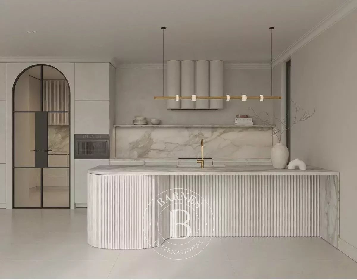 La nouvelle distribution distingue clairement l’espace de jour de la zone privée. Dès l’entrée, l’appartement s’ouvre sur un vaste espace décloisonné bénéficiant de vues directes sur la mairie, les jardins d’Alderdi Eder et la baie de La Concha. Cet espace de vie comprend un grand salon, un séjour et une cuisine moderne intégrée, ainsi qu’un cabinet de toilette invités.