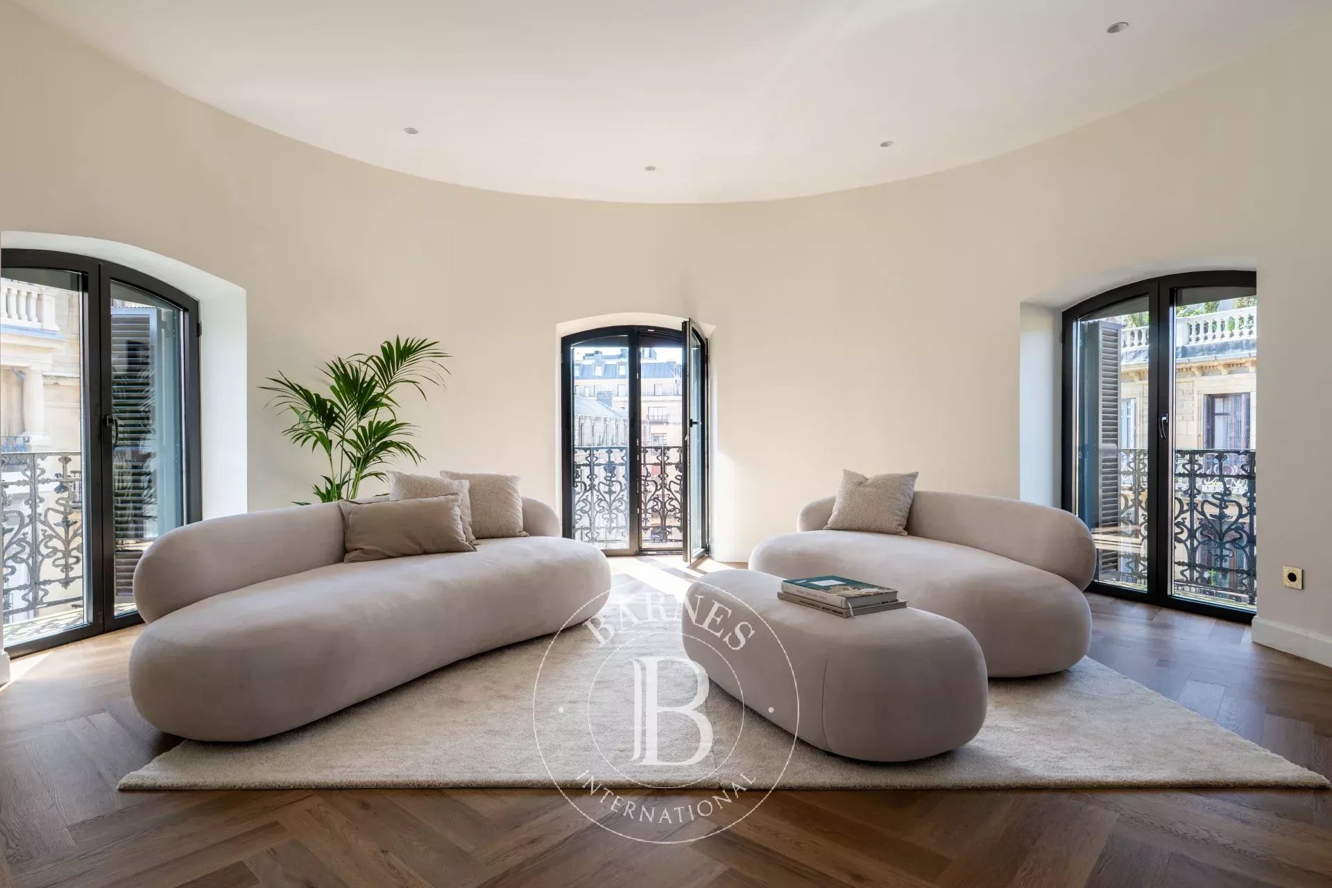 L’entrée s’ouvre sur une vaste pièce de réception avec salon, salle à manger et cuisine ouverte, conçue comme un espace généreux, élégant et parfaitement fonctionnel. La cuisine moderne, entièrement équipée, dispose d’un îlot central et s’intègre harmonieusement à la salle à manger et au salon, agrémenté d’une cheminée décorative. L’ensemble se prolonge vers un agréable espace de séjour situé dans l’extrémité ovale caractéristique de l’appartement, l’un de ses éléments architecturaux les plus singuliers.